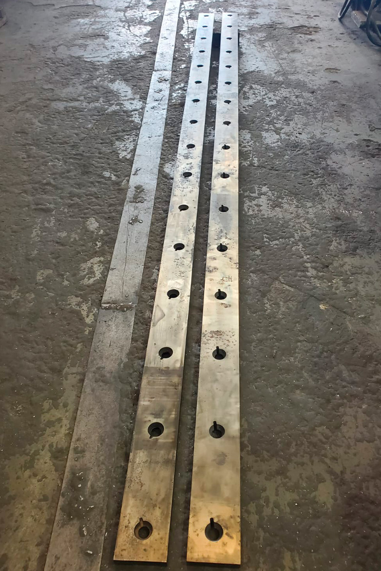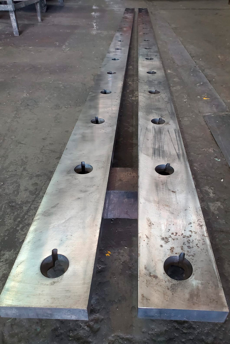 Cuchillas para Cizalla Largo: 124 1/8" Alto: 3 3/4" Ancho: 7/8" Distancia entre barrenos: 8" Cantidad de barrenos: 16