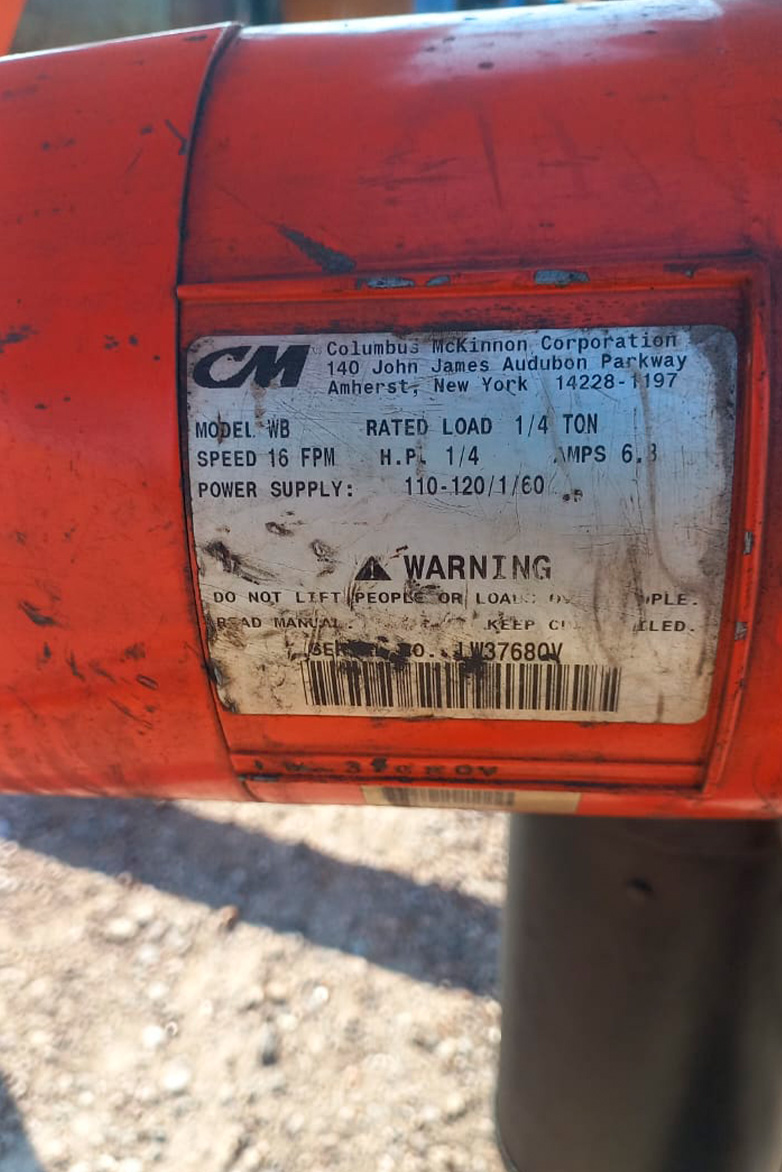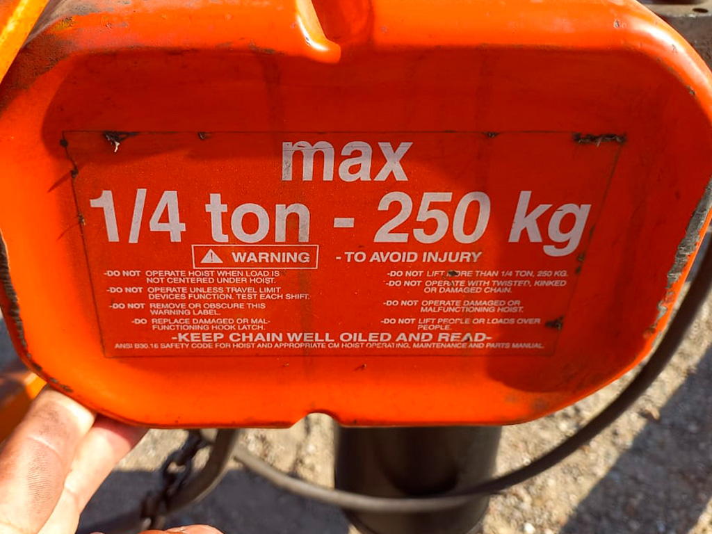 Polipasto CM Capacidad: 1/4 Ton Modelo: WB Serie: LW37680V Sistema: Eléctrico Tipo: Cadena Motor: 1/4 HP Voltaje: 110V