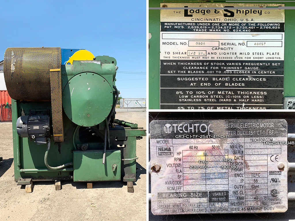 Cizalla Capacidad: 8' x 1/2" Modelo: 0808 Serie: 48467 Sistema: Mecánico Motor: 15 HP Velocidad del motor: 1760 / 1450 RPM Voltaje: 230V / 460V